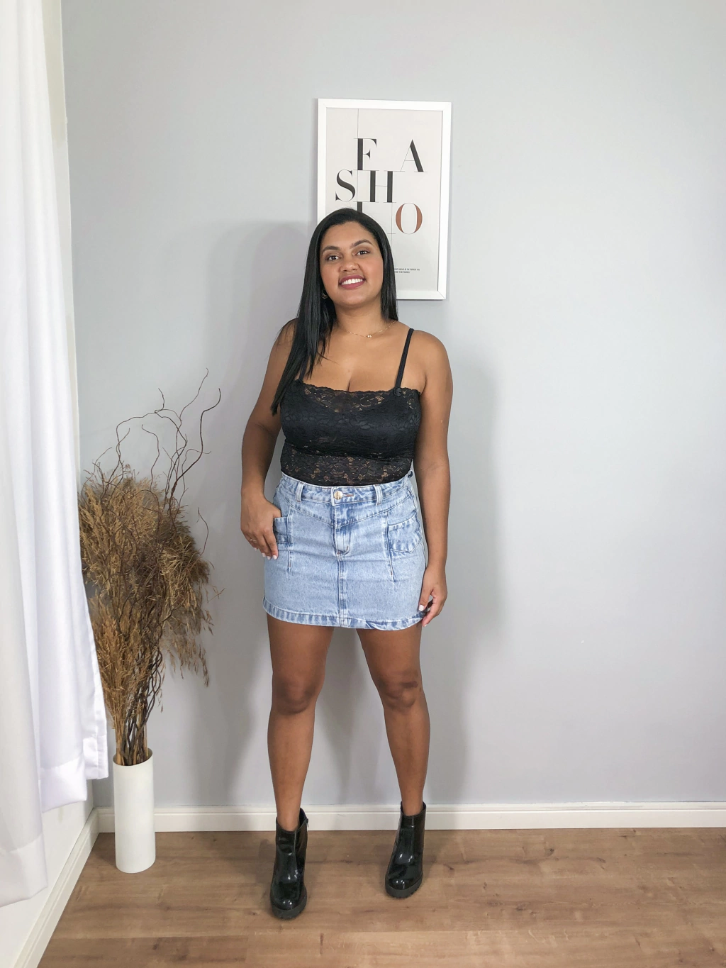 Blusinha de alça rendada. Composta por tecido em 61% poliéster, 30% em viscose e 9% de elastano. Possui forro na região da frente do busto, junto com bojo.