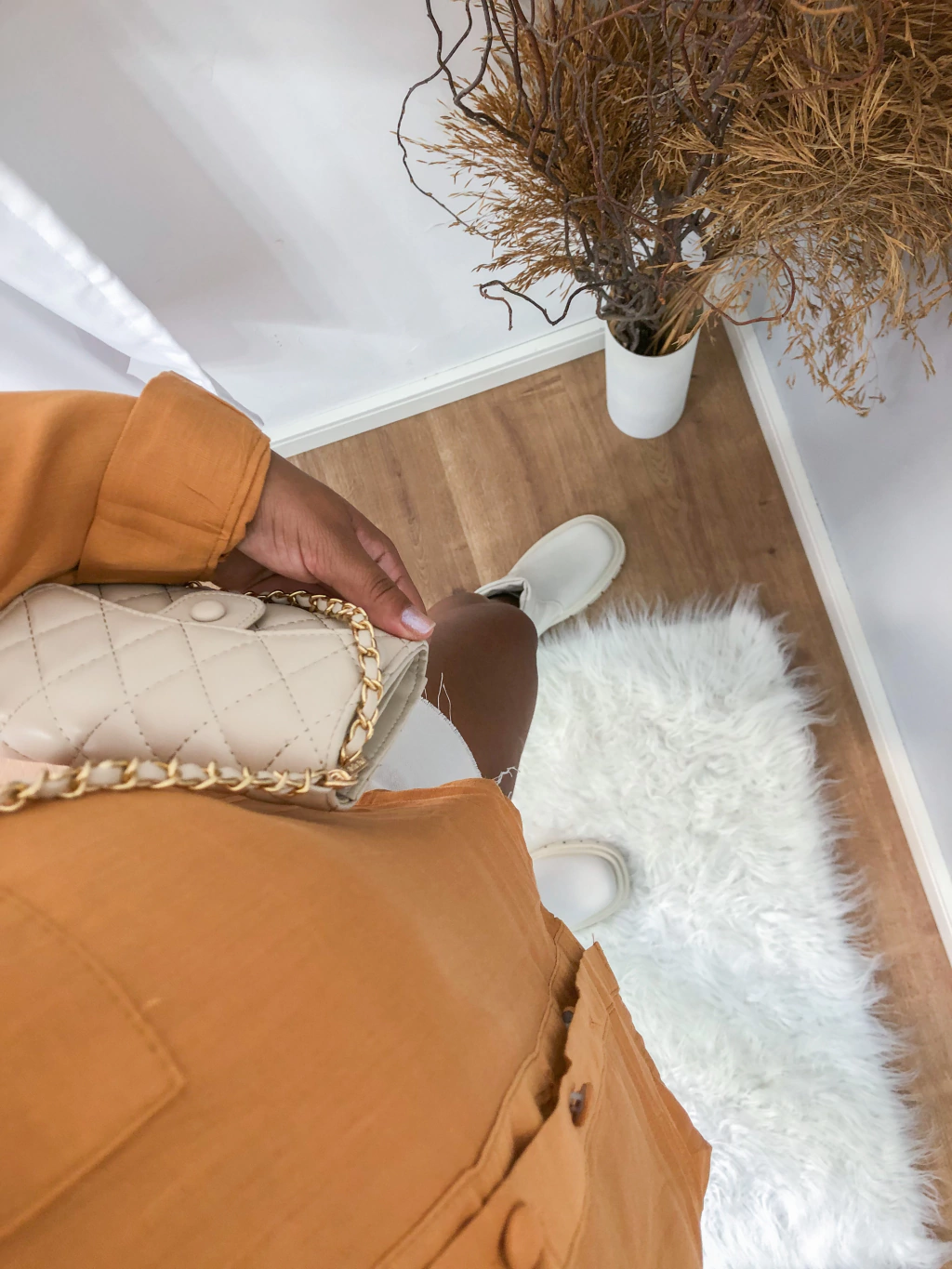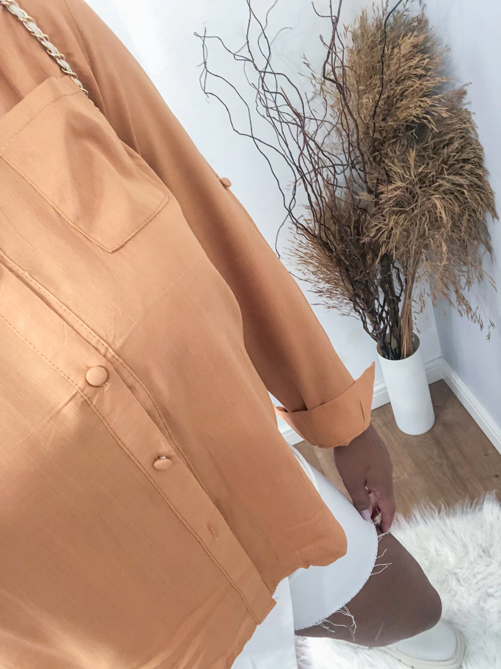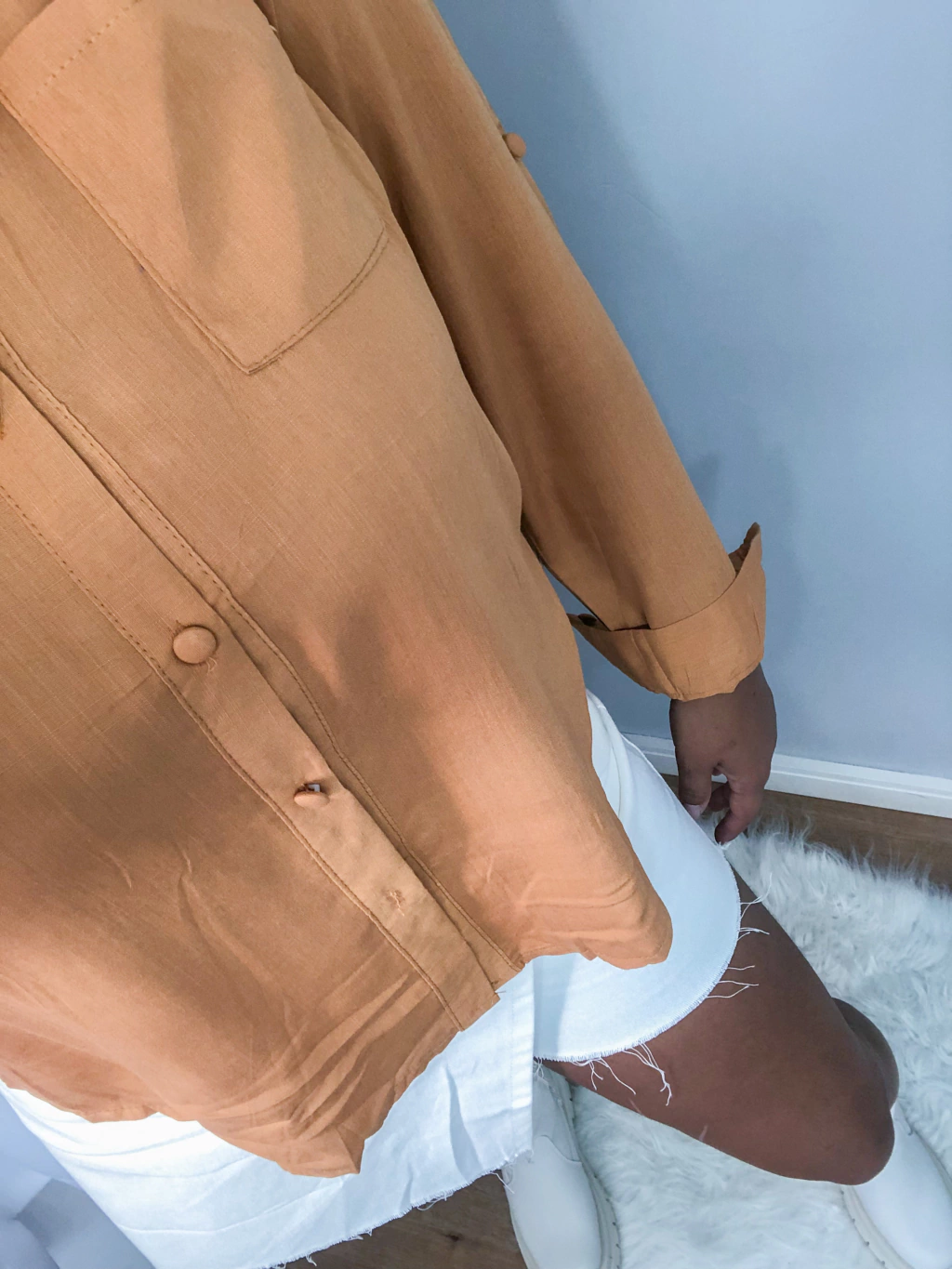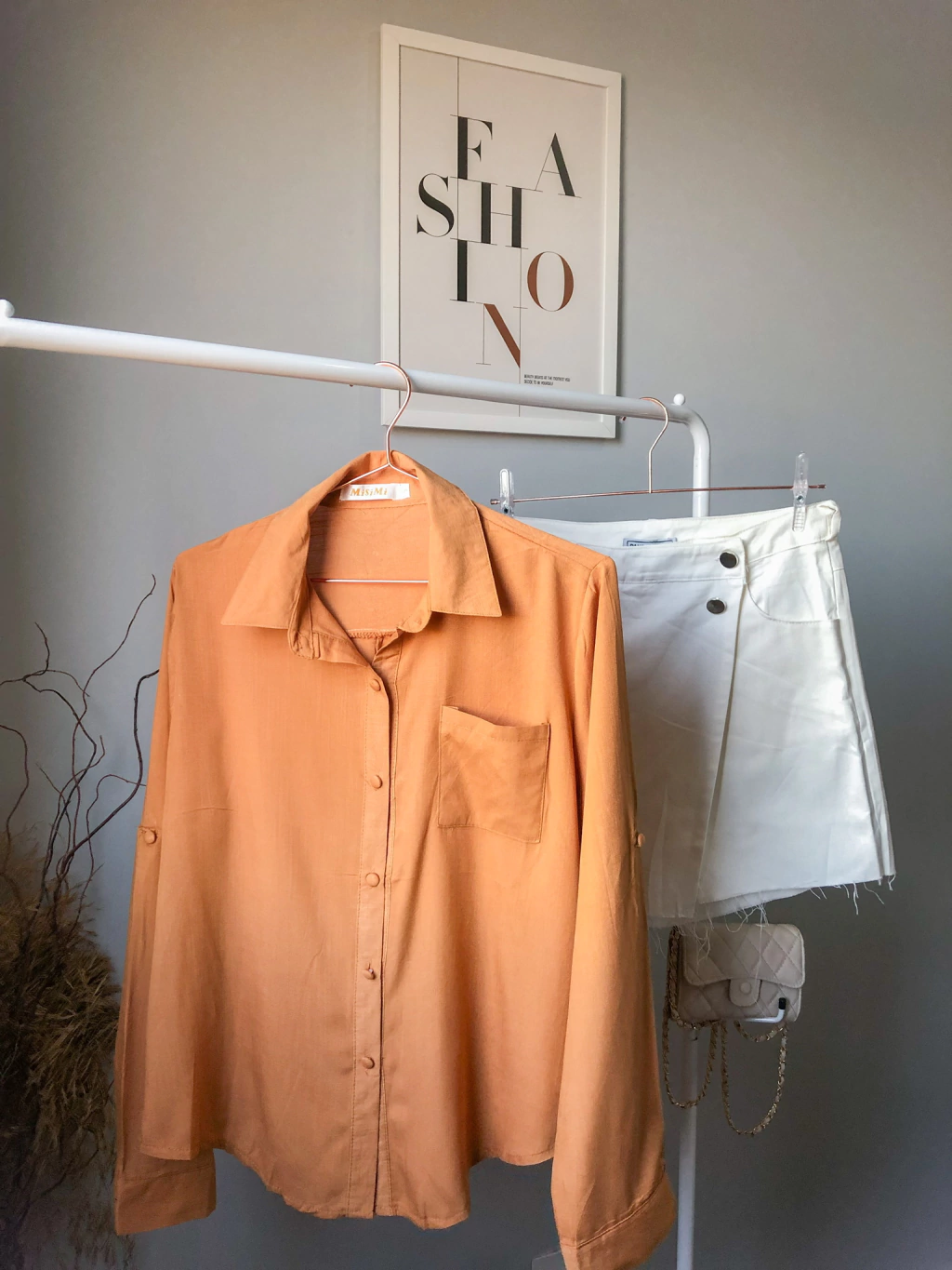 Possui detalhe de bolso no lado esquerdo do peito, botões encapados na cor da camisa e é possível encurtar a manga, possui botão para ajuste no ombro.